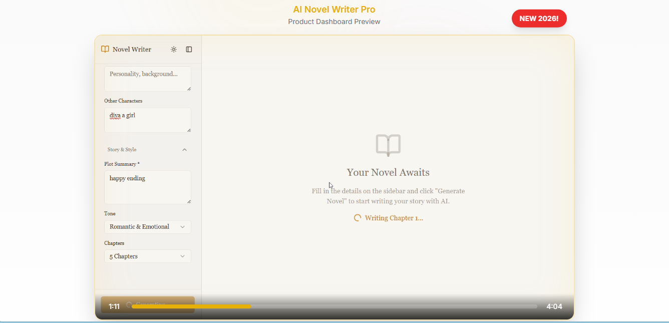 Open AI Novel Writer and fill simple fields like Title, Genre, Topic & Situation, Style & Tone, Characters, and Plot Summary. This takes 1–3 minutes.