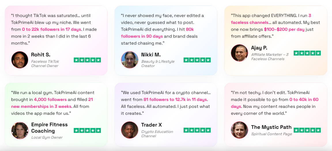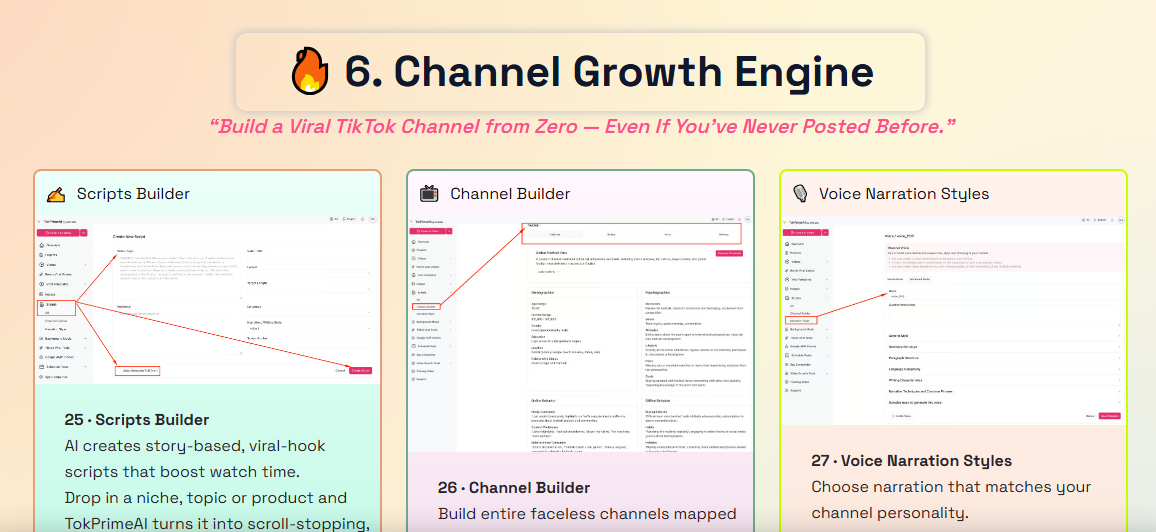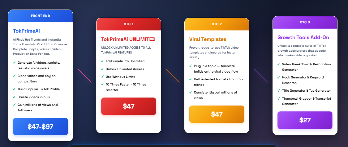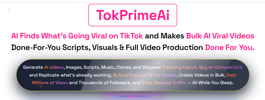 TokPrimeAI positions itself as an all-in-one TikTok growth engine. According to its sales messaging Sales Page - TokPrimeAI, it claims to: