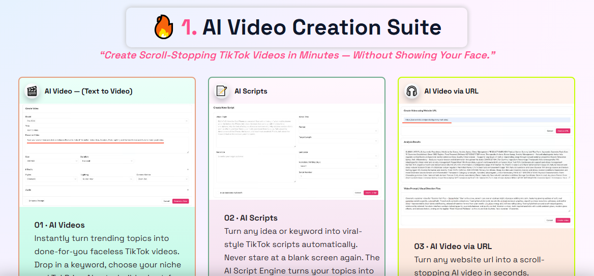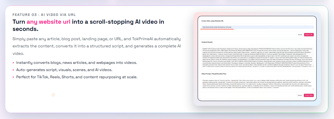 You can just paste the link of your physical product, digital product, blog post, or even an affiliate offer — and it turns that content into a TikTok-style video. For busy creators, that removes a major content creation barrier.